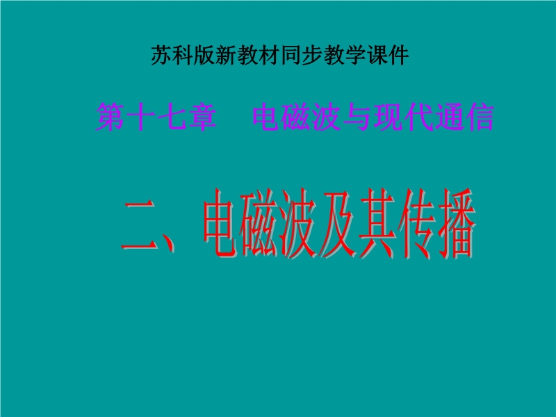 【内容简介】苏科版《17.2电磁波及其传播》ppt+flash课件,本课件以苏科版新教材第十七章第二节为基础制作,共有32张幻灯片,并插入了两个flash动画。课件引导学生认识了波,讨论了波的基本特征,用flash动画模拟了电磁波的产生,并引导学生通过小实验探究了电磁波的特征,展示了电磁波的广泛应用等。本课件可供教学电磁波时参考使用。