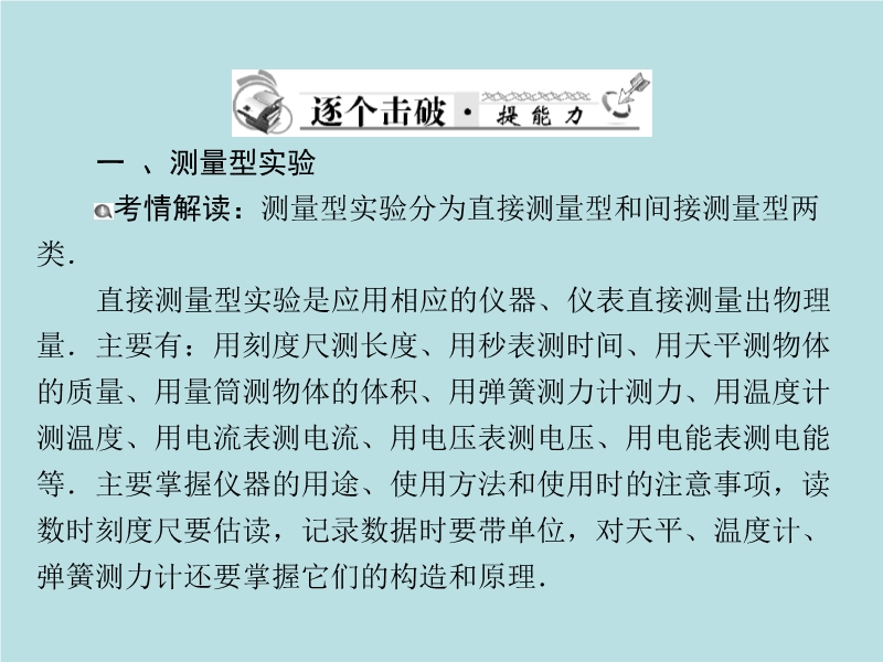 【内容简介】中考专题突破《专题二 实验题》ppt课件,本课件以中考专题复习为目的制作,是实验题专题,共有52张幻灯片。课件引导学生总结了实验题的答题技巧、三个重要的实验、初中物理的基本仪器,课件将实验题分为三种类型:测量型实验、探究型实验、设计型实验,每种类型的实验都精选了典型的例题和有针对性的练习,教学设计较新颖、独特。可供专题复习“实验题”时参考使用。
