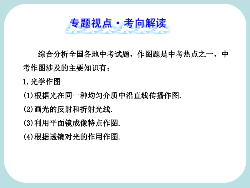 【内容简介】本2013年中考二轮复习《方法专题:分析与作图》ppt课件课件是二轮知识专题复习:《方法专题:分析与作图》,课件共44幻灯片,第一个环节是专题视点,研读考纲,课件重心放在典例探究,专题攻略,重点复习了:利用光的直线传播画图 画光的反射和折射光线 利用平面镜成像的特点作图