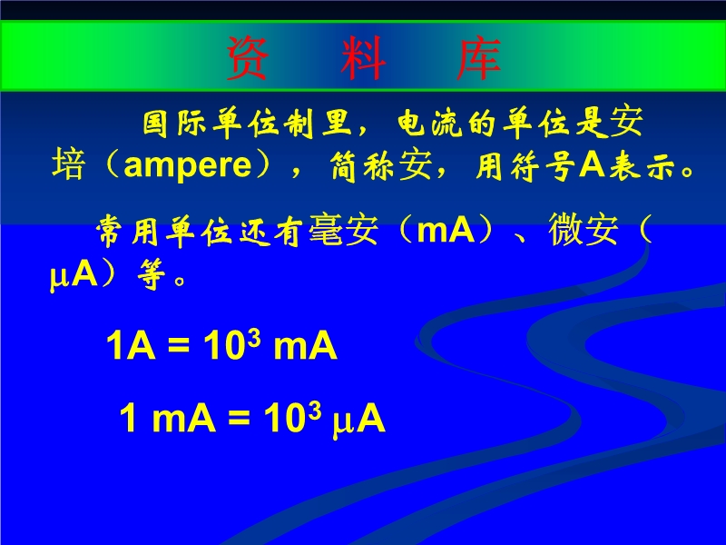【内容简介】本课件以北师大版新教材第十一章第四节《11.4电流》为基础制作,共有36张幻灯片。课件首先用一个flash动画形象地将电流与水流相类比,让学生更好地认识了电流,展示了一些常见的电流值,然后引导学生学习了电流表,展示了常用的电流表,并讨论了它的使用方法等。本课件可供教学“电流、电流表”时参考使用。
