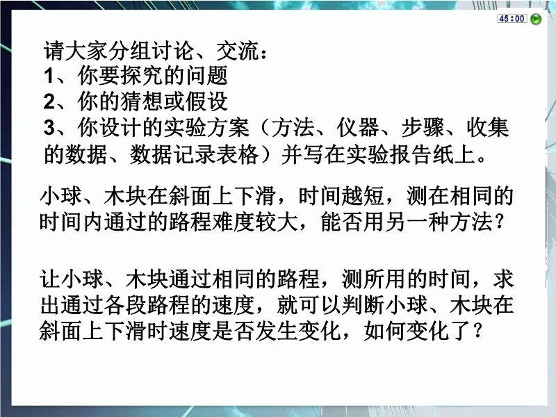 【内容简介】沪科版精品课件:《2.4科学探究:速度的变化》ppt+flash课件,本课件以沪科版新教材第二章第四节为基础制作,共有17张幻灯片和1个flash。课件引导学生经历了科学探究的基本环节,具体探究了物体在斜面上的运动情况,探究环节完整,能激发学生的学习兴趣、培养学生的探究能力等。