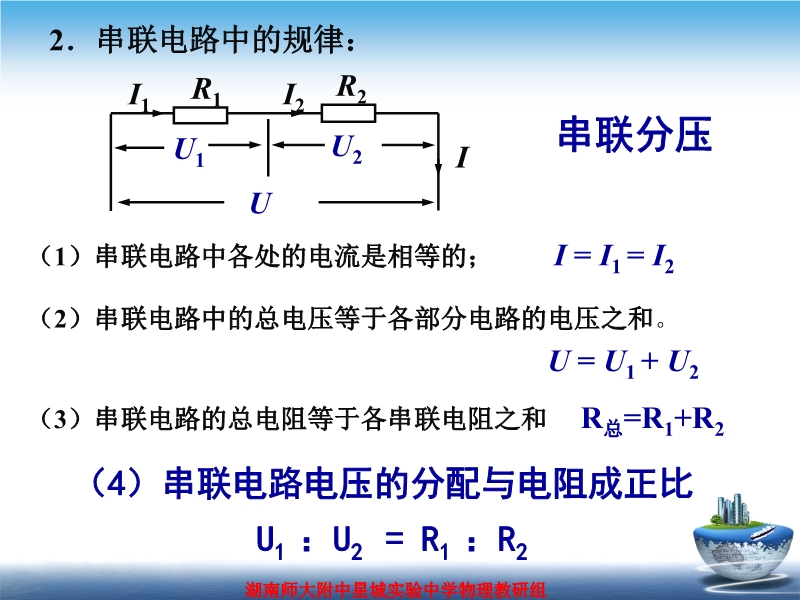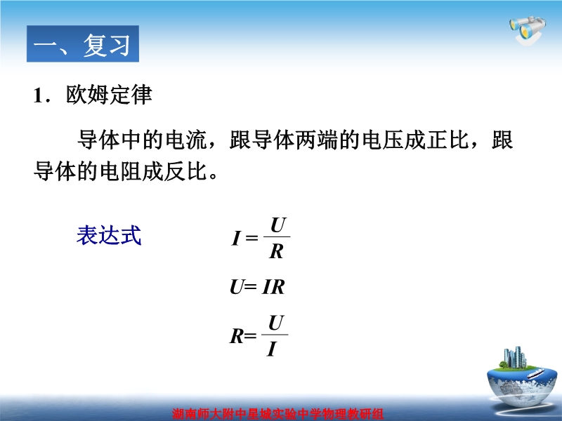 【内容简介】湖南师大附中星城实验中学《第十七章 欧姆定律的应用》ppt习题课,课件首先复习本章主要知识点,而重点是能力的培养,从而下几个方面组织学生复习:运用欧姆定律进行串联电路计算 运用欧姆定律进行并联电路的计算 关于电路变化问题的定性分析(滑动变阻器阻值的变化问题、开关的闭合与断开问题