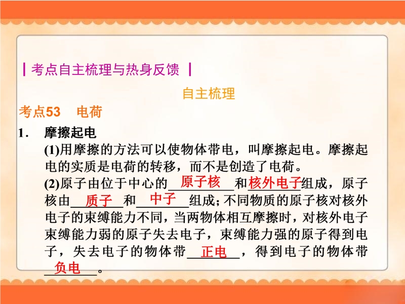 【内容简介】2014届中考物理复习《电荷 电路》ppt课件,课件为2014年中考复习制作,课件共有30张幻灯片,课件首先通过“考点自主梳理与热身反馈 ”引导学生复习了本章主要知识点:电荷、电路,这部分内容主要通过填空的形式进行交互,再现知识的过程。“考向互动探究与方法归纳”环节,引用了2011-2013年中考试题,对中考的重点难点知识:电功率及其测量的理解等,进一步提高学生运用知识的能力。每道中考试题具有解析和答案。