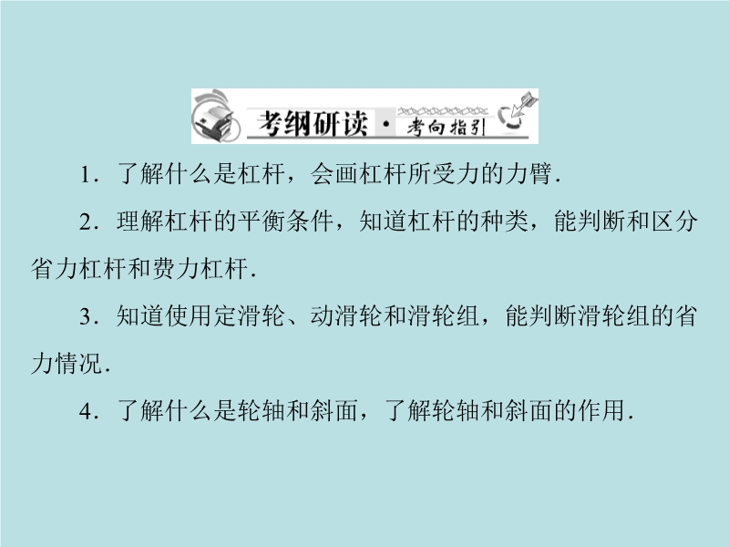 【内容简介】【最新—中考必备】(安徽专版)2014中考复习方案课件(皖考解读+考点聚焦+皖考探究):第8课时 运动和力,课件根据现行的人教版教材编辑的14届中考复习课件,课件共30张ppt幻灯片,课件分为如下几个环节组织复习:一、解读考纲,分析2013年安徽省现行考试的要求,明确本章主要考点以及各个考点对用的级别要求。分析了2011-2013三年安徽省中考考查情况,预测了2014年安徽省命题的形式和考察重点等。二、考点聚焦,本环节采用填空的形式,紧扣现行的教材,进一步熟悉教材。三、皖考探究,精选了2011-2013年安徽省部分中考试题,展示了:力和运动关系、摩擦力、牛顿第一定律 物体的惯性, 二力平衡等,通过课件展示解析,总结方法,提高学生能力,供教学参考使用。