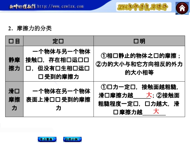【内容简介】,课件适用于2014年中考复习适合于各种版本,课件共有23张ppt幻灯片,课件组织学生通过“考点聚焦”,解读本章主要考点:考点1 力及其描述考点2 弹力 考点3 重力 考点4 摩擦力,分析考试的要求,明确复习的目的,再通过“归类示例”,引导学生通过对比、列表等手段对本章重要的知识点进行点拨、剖析,提高学生运用知识的能力。