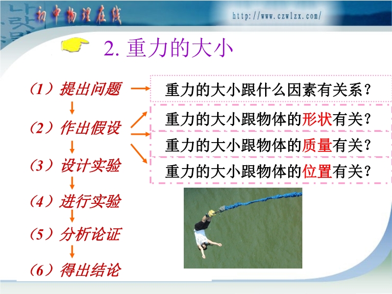 【内容简介】人教版《7.3重力》PPT课件,本课件以人教版新教材第七章第三节《7.4重力》为基础制作,共有40张幻灯片。课件通过引导学生观察生活中的现象,引导学生认识了重力的存在,讨论了重力的产生原因、重力的施力物体,课件还引导学生探究了重力的大小与质量的关系,让学生讨论了重力的方向及在生活中的应用,让学生了解了物体的重心等。