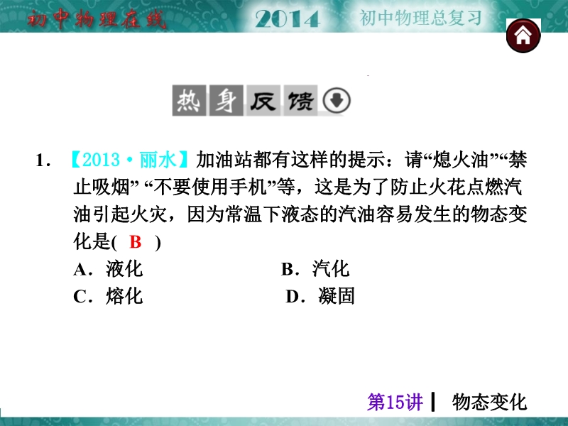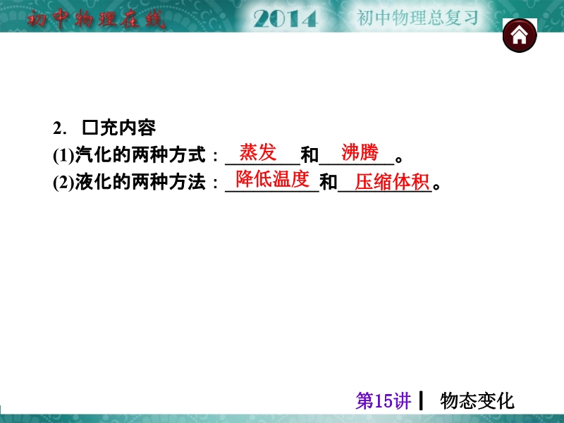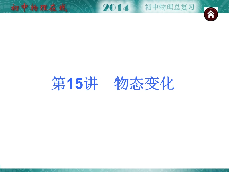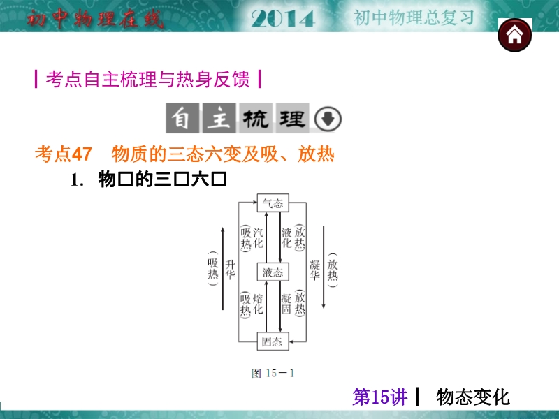 【内容简介】【中考夺分天天练】2014年人教版中考物理总复习:第15讲 物态变化课件共有32 张幻灯片,课件“考点自主梳理”引导学生在课件自主复习的基础上,梳理本章主要知识要点:“物质的三态六变及吸、放热 解读物态变化中的图像 自然界中的水循环”,通过“热身反馈”展示2013年中考试题,以达到学以致用的目的,一内容般地这部分简单,难度不大,引导学生认识中考考察的方式,课件的重点“考向互动中考探究与方法归纳”精选典型和热点内容的2013中考试题,通过分析、归纳突破本章的难点和突出热点,“考题自主训练与名师预“自主练习,预测2014