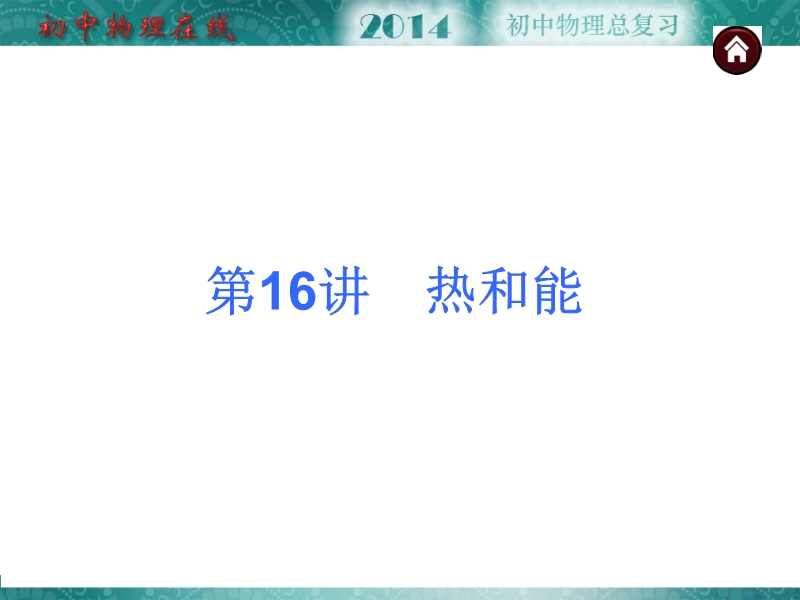 【内容简介】【中考夺分天天练】2014年人教版中考物理总复习:第16讲 热和能课件共有30 张幻灯片,课件“考点自主梳理”引导学生在课件自主复习的基础上,梳理本章主要知识要点:“分子热运动与内能 内能、温度与热量的比较 比热容、热值与热量的相关计算”,通过“热身反馈”展示2013年中考试题,以达到学以致用的目的,一内容般地这部分简单,难度不大,引导学生认识中考考察的方式,课件的重点“考向互动中考探究与方法归纳”精选典型和热点内容的2013中考试题,通过分析、归纳突破本章的难点和突出热点,“考题自主训练与名师预“自主练习,预测2014