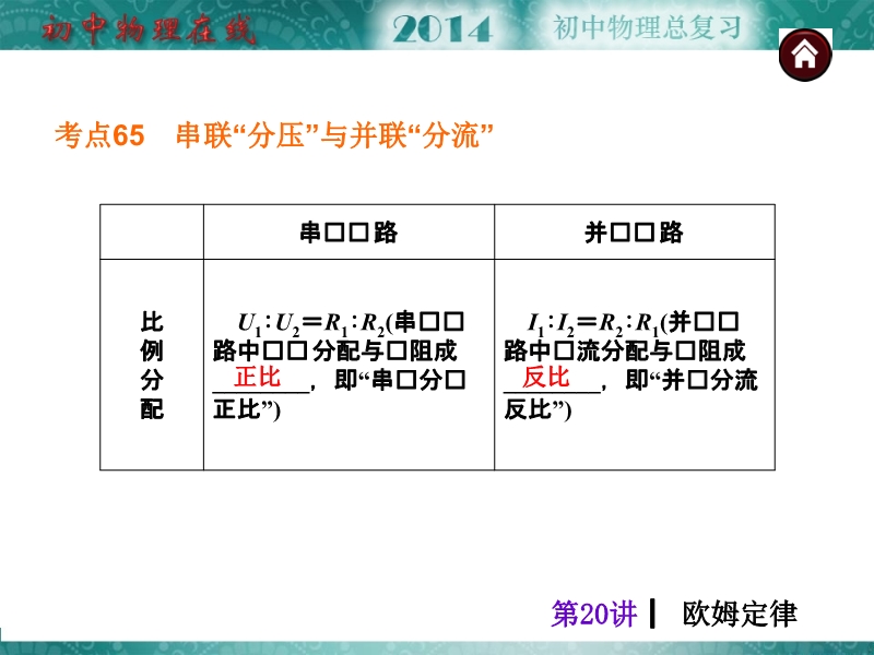 【内容简介】【中考夺分天天练】2014年人教版中考物理总复习:第20讲 欧姆定律课件共有 38 张幻灯片,课件“考点自主梳理”引导学生在课件自主复习的基础上,梳理本章主要知识要点:“探究:电流与电压、电阻的关系 欧姆定律及其应用 串联“分压”与并联“分流” 动态电路物理量变化的分析”,通过“热身反馈”展示2013年中考试题,以达到学以致用的目的,一内容般地这部分简单,难度不大,引导学生认识中考考察的方式,课件的重点“考向互动中考探究与方法归纳”精选典型和热点内容的2013中考试题,通过分析、归纳突破本章的难点和突出热点,“考题自主训练与名师预“自主练习,预测2014