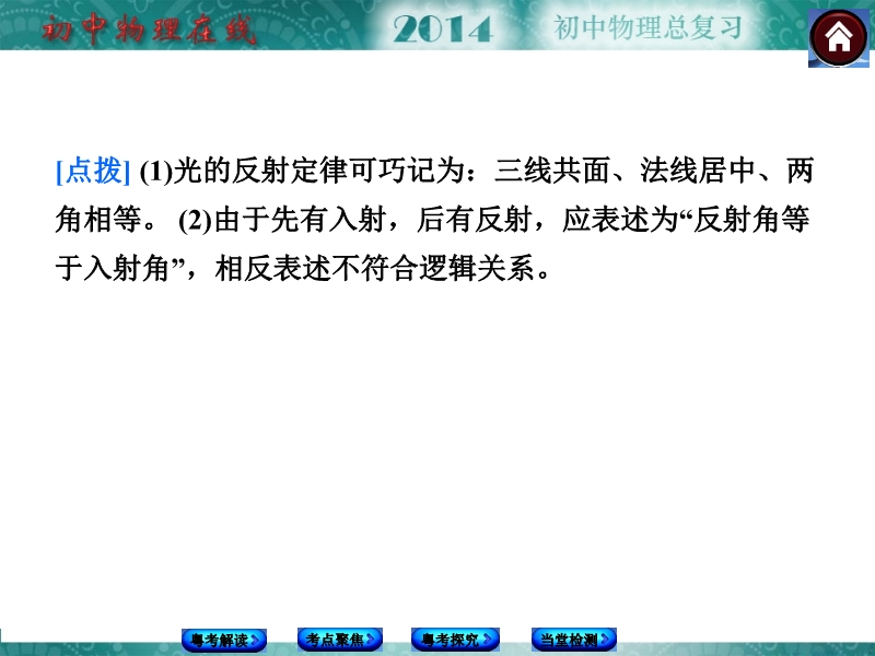 【内容简介】2014中考复习方案课件(广东专版):第4单元 光现象,课件共有40张幻灯片。课件首先通过“粤考解读”环节引导学生认识了本章知识点在考纲要求,常考题型和展望14年各个知识点的考察的热度,课件再通过“考点 聚焦”在现本章知识要点:光的直线传播 光的反射 平面镜成像 光的折射 光的色散、物体的颜色 ,进一步熟悉教材。课件的重点“粤考探究”按考点分类型,以2013中考试题为抓手组织学生复习。