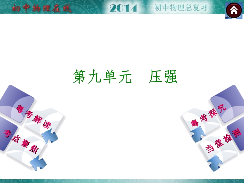 【内容简介】2014中考复习方案课件(广东专版):第9单元 压强,课件共有35张幻灯片。课件首先通过“粤考解读”环节引导学生认识了本章知识点在考纲要求,常考题型和展望14年各个知识点的考察的热度,课件再通过“考点 聚焦”在现本章知识要点:压力 压强 液体压强 连通器 大气压强 流体压强与流速的关系 ,进一步熟悉教材。课件的重点“粤考探究”按考点分类型,以2013中考试题为抓手组织学生复习。