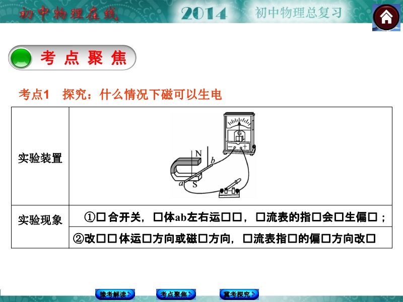 【内容简介】2014中考复习方案课件(河南专版):第21课时 电与磁(2),课件共有20张幻灯片。课件分三个板块:第一板块《预考解读》引导学生解读中考考纲,目前中考考什么,分析了近三年河南省中考题型、分值、难易程度和考点等,同时预测2014命题方向。第二板块《考点聚焦》复习了如下考点:磁生电 发电机,组织学生,进一步熟悉教材、重视双基的落实。课件的第三板块《豫考探究》,按考点分成几大类型,以2013中考试题为抓手组织学生复习,最后展望了中考试题的命题角度。课件设计合理科学,供2014年中考首轮复习参考使用。