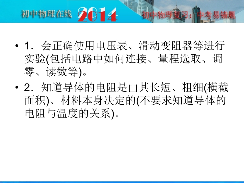【内容简介】2014年人教版总复习(知识梳理+真题体验+考点透析+实验探究+易错档案):17 电压 电阻,课件,27张ppt幻灯片,课件从五个环节组织复习:1.知识梳理:梳理本章重要知识点:电压、电阻、滑动变阻器等、2真题体验:精选了2011-2013年中考典型试题、同过解析提高学生运用知识的能力,3、考点透析;解读中考要点和热点,4、实验探究环节组织学生复习了本章的实验 5、易错梳理档案环节,组织学生回顾近几年中考,展示了中考易错题和容易出错的考点等