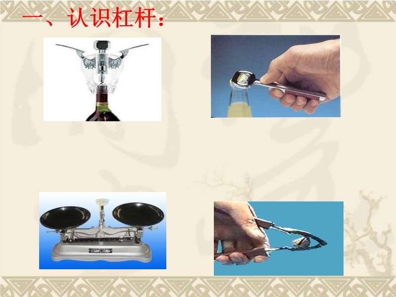 【内容简介】本课件以沪科版新教材第十章第一节为基础制作,共有53张幻灯片。课件首先展示了生活中常用的杠杆工具,让学生认识总结它们的共同特点,让学生自主建立杠杆的概念,然后引导学生认识了杠杆的五要素,并讨论了如何画杠杆的力臂,再次引导学生通过实验探究了杠杆的平衡条件,交流讨论了实验中应该注意的问题,最后引导学生对杠杆进行了分类等。课件中精选了典型的例题和习题,本课件可供教学“杠杆”时参考使用。