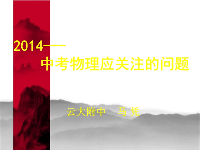 2014年云南中考复习:《2014应关注的问题》PPT课件,课件24张幻灯片,内容: 一、云南中考物理 大盘点 二、云南省近6年中考试题命题走向 三、解读2014版《云南省初中学业水平考试标准与考试说明》等。