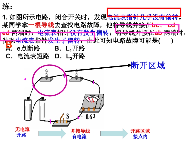 专题复习《电路故障分析》ppt课件由16张幻灯片组成。电路故障分析是综合考查学生电路知识、电流表、电压表特点以及电路中的物理量的规律等知识的一种类型题,也是考查学生解决实验中可能遇到的实际问题的能力的好形式,因而是考试中必不可少的题型。电路故障,常见的情况是断路和短路,检验的方法有小灯泡法、电压表法、电流表法、导线法。下面以只存在一处故障为例说明故障判断的方法.