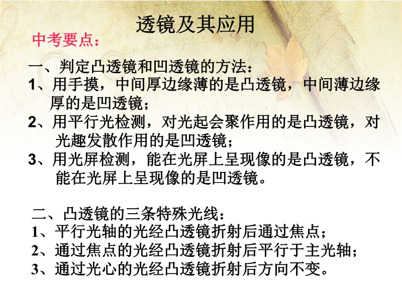 【内容简介】浏阳市官渡镇初级中学:《第五章 透镜及其应用》复习ppt课件,共有19张幻灯片和6个flash动画。课件引导学生详细而具体地回顾了本章的主要内容,展示了本章的具体知识,按节进行回顾知识,通过flash动画模拟,再现知识的生成过程。