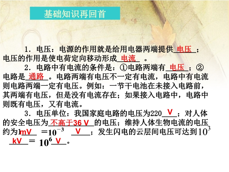 【内容简介】2015年人教版单元复习课件:《第十六章 电压 电阻》ppt课件,课件共有24幻灯片,课件分入下几个环节:1.知识网络,进一步理清本章的知识点形成知识网络化,2,基础知识再回首,再现本章主要知识要点。3.典型例题精讲,精选典型试题,就中考中的热点展示例题,提高能力。4易错习题集,列举学生在月考和平时训练中易错题目。