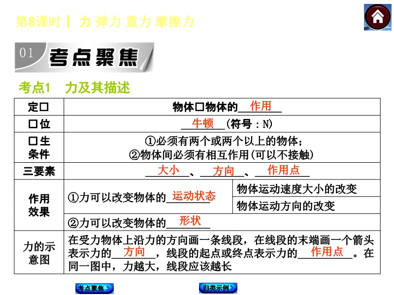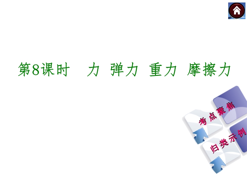【内容简介】2015届人教版中考复习方案:《第8课时+力+弹力+重力+摩擦力》ppt课件,课件根据现行的人教版教材编辑的15届中考复习课件,课件共28张ppt幻灯片,课件分为如下几个环节组织复习:1.考点聚焦,按照如下考点:考点1 力及其描述 考点2 弹力和弹簧测力计 考点3 重力 考点4 摩擦力 ,组织学生复习本节基础知识点,课件主要通过填空形式再现基础知识点,同时通过点拨形式对该知识点的难、易错指导、辨析等。2.归类实例,课件总结中考考查知识点的类型,通过2014年中考试题的展示,解析和点评,总结方法,提高学生能力,课件最后通过方法集锦,突出重点、突破难点。