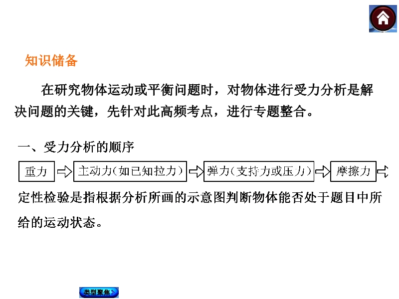 【内容简介】2015年安徽省中考复习方案:专题突破课件《专题1+物体受力分析与推导》ppt课件,共有28张幻灯片。课件主要分析了力学学中的难点问题,课件总结受力分析如下几种类型 类型一 水平面上的物体 类型二 斜面上的物体 类型三 悬挂的物体 类型四 被夹持的物体 类型五 在空中飞行的物体