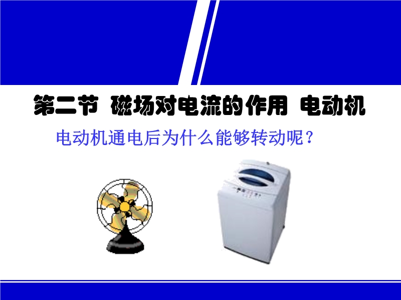 课件分三部分:一、磁场对电流的作用。教学中宜先做演示实验,然后再利用PPT分析总结此作用力的方向与电流方向和磁场方向之间的关系;二、磁场对通电线圈的作用。课件中为了突破难点,特用了几张图片结合FLASH动画来分析“如何才能使线圈到达平衡位置时能持续转动下去?”,从而为下一环节引入换向器做好铺垫;三、换向器和直流电动机。这部分属概念内容,为了增加学生对直流电动机的理解,课件中用另一个动画来认识直流电动机的组装过程,激发学生的兴趣。