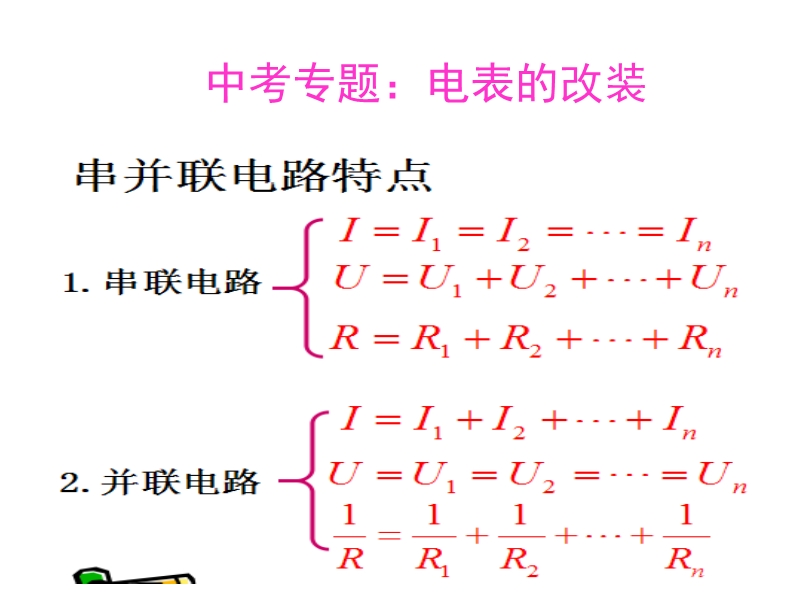【内容简介】安徽省中考2015年专题复习《电表的改装》ppt课件,课件有10张幻灯片,针对近几年来安徽中考试题出现的电表的改装问题,制作课件,供同行参考使用。