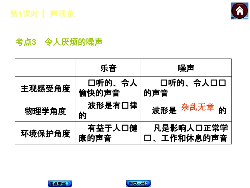 【内容简介】【中考复习方案】2015年江苏省中考物理复习课件:《第1课时 声现象》PPT课件,课件共张23张t幻灯片,课件从如下几个方面组织学生复习:1.考点聚焦,引导学生复习了:声音的产生与传播、乐音的特性、噪声的危害和控制、超声与次声,课件主要通过填空的形式再现本章主要知识点,引导学生进一步熟悉教材,落实双基。2、归类实例,根据知识点,列举了大量中考试题,提高学生的解题能力,每道试题都进行了解析和点评,培养学生运用知识解决问题的能力。同时对解题的方法进行归类总结,课件最后学习的方法进行总结,提升,复习了:转换法在声现象中的应用和回声现象等.