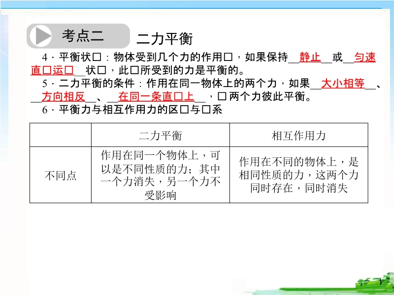 【内容简介】【中考精英】2015中考物理《第8讲运动和力》PPT+同步测试练习课件共有 12 张幻灯片,课件分四个部分:1、考点梳理,梳理本章知识要点,2例题精选:课件精选了到2014年中考试题,重在通过例题剖析,分析考点,总结归纳方法。3易错易混环节:(1)误认为在空中飞行的足球,仍受到脚对它的作用力。:(2)拉着小球匀速上升,若撤去拉力,误认为小球会立即向下运动。(3)匀速上坡的汽车若所受外力全部消失,误认为汽车会下滑。(4)混淆平衡力与相互作用力。,4、是一个word格式的课堂训练。