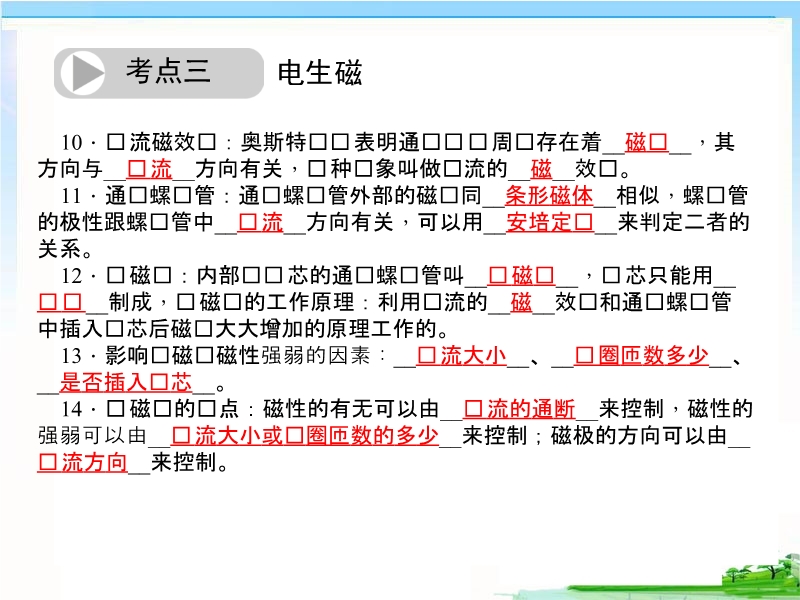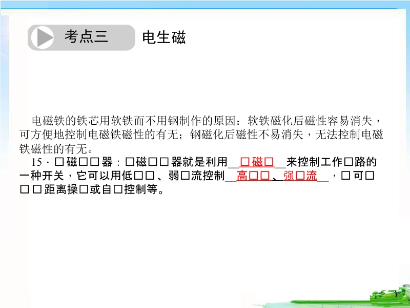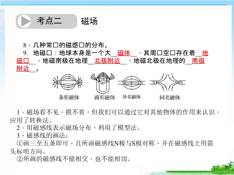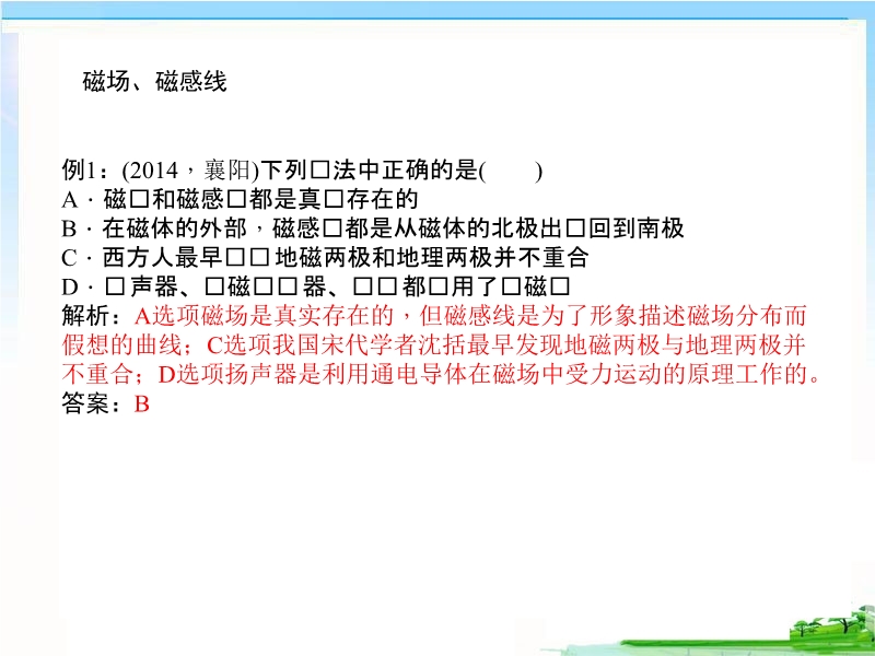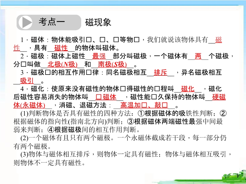 【内容简介】【中考精英】2015中考物理《第24讲 磁现象 电生磁》PPT+同步测试练习课件共有16张幻灯片,课件分四个部分:1、考点梳理,梳理本章知识要点:磁现象和电生磁,2例题精选:课件精选了到2014年中考试题,重在通过例题剖析,分析考点,总结归纳方法。3易错易混环节,对相似知识点就行区别,4、是一个word格式的课堂训练。