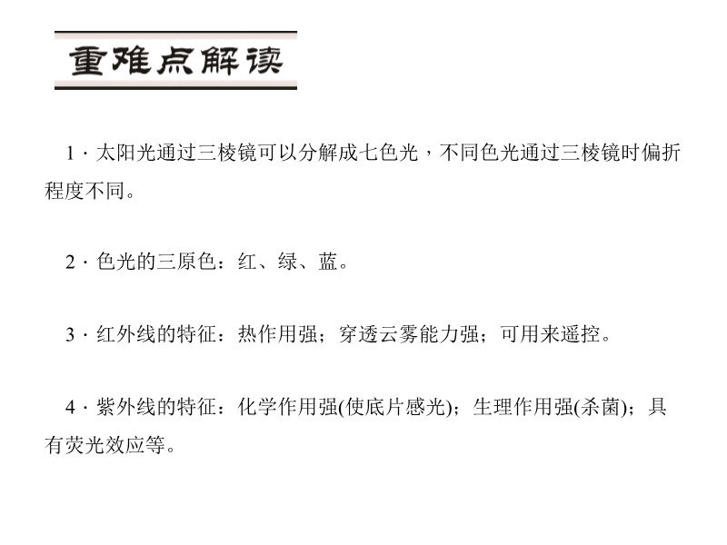 【内容简介】练闯考:人教版《4.5光的色散》PPT课件,课件共有17张幻灯片,课件首先引导学生认识了本节重难点,第二环节是名题引路,精选中考试题,进行详细解析,同时归纳方法,第三环节是预习导读,展示本节基本知识点,通过填空形式展示,第三环节是课内精炼,按照如下知识点:光的色散,精选试题,提高学生运用知识的能力,课件最后是课时达标环节.