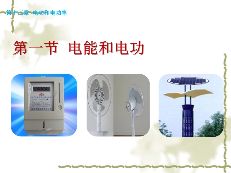 【内容简介】北师大:《13.1电能和电功》ppt 课件,共有33张幻灯片。课件从能量转化的角度引导学生认识了电功的意义、概念,学习了电功的国际单位及常用单位,课件还展示了各种形式的电能表,认识了相关数字及符号的意义,讨论了相关的计算等。课件中有例题和习题.