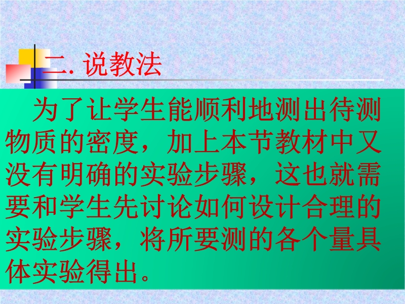 【内容简介】人教版:《6.3测量物质的密度》ppt说课,共有23张幻灯片,课件主要分析了本节教材的特点、教学目标、教材的重难点、教学设计思路、教具等,并详细展示了教学设计的过程。