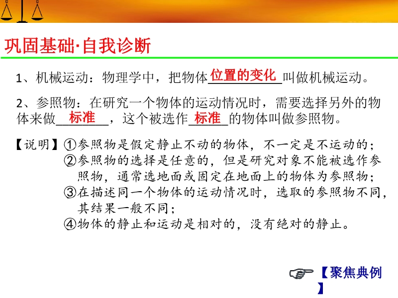 【内容简介】【聚焦中考】广东省人教版2016年中考复习课件:《第1章 机械运动》ppt课件,课件共48张ppt幻灯片,课件按知识点:长度和时间的测量 运动和静止的相对性 运动的快慢,每个知识点通过巩固基础·自我诊断再现基础知识,热点考向·直击中考列,举2015年中考试题,强化知识点,最后头脑风暴·自我反馈,反思问题提高能力.