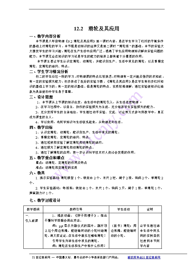 - 8102025春人教版八年级下册物理教学设计:12.3 滑轮(附教学反思)
