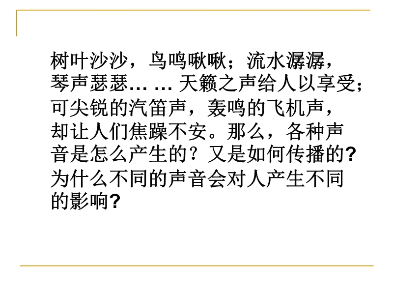 【内容简介】人教版:《2.1声音的产生与传播》PPT课件,共有65张幻灯片,课件引导学生通过几个具体的小实验探究了声音的产生原因,认识了什么是声源,课件还引导学生探究了声音的传播,用视频演示了真空不能传播声音的实验,效果明显,让学生认识了声音的传播需要介质,并且以波的形式传播,最后让学生了解了声音的传播速度。