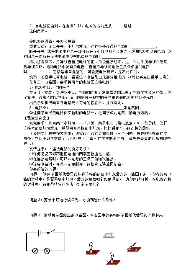 通过动手实验,认识短路、断路、通路,知道电路的组成;能从能量的角度认识电源和用电器的作用,从电路的组成认识开关的作用;能画常见的电路元件符号。
