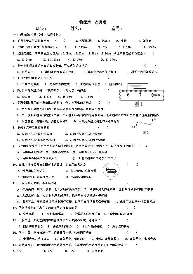 7.要测量图2所示的一根曲线MN的长度,你认为可取的方法是 ( )