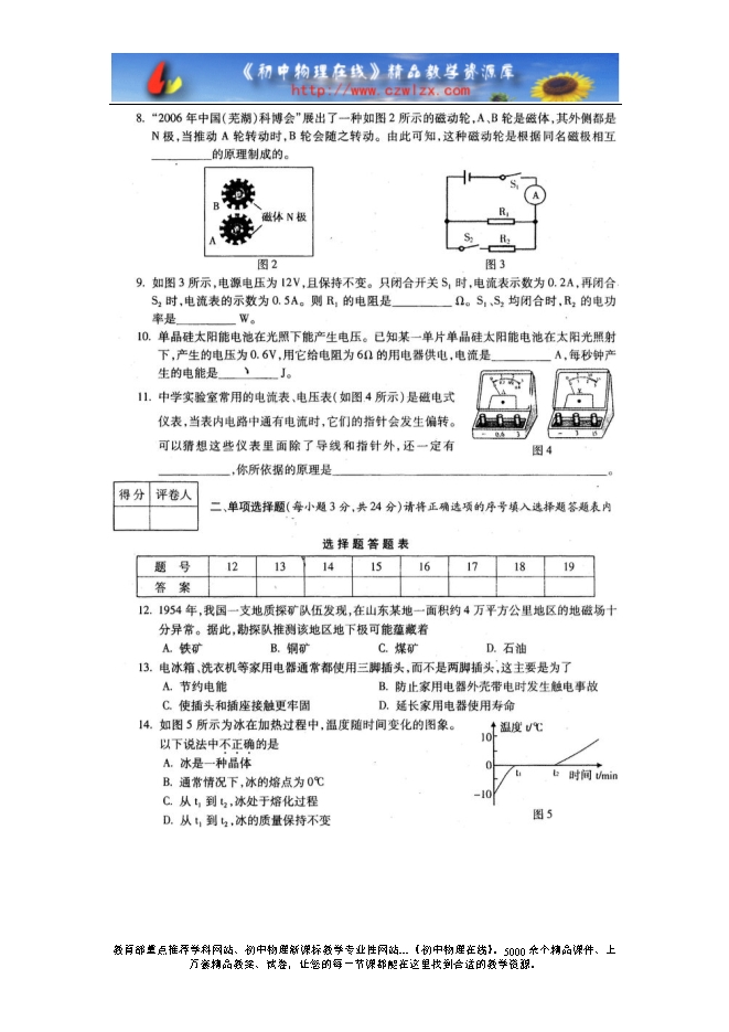 【内容简介】芜湖2006-2007九年级物理上学期期末试卷及答案(扫描版)