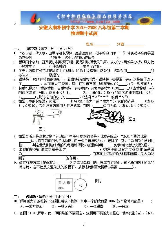 太湖朴初中学07-08八年级下期中试题