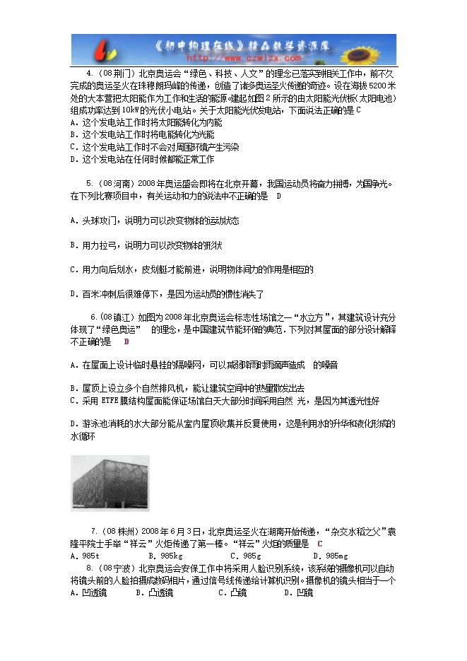 4.(08荆门)北京奥运会“绿色、科技、人文”的理念已落实到相关工作中,前不久完成的奥运圣火在珠穆朗玛峰的传递,创造了诸多奥运圣火传递的奇迹。设在海拔5200米处的大本营把太阳能作为工作和生活的能源。建起如图2所示的由太阳能光伏板(太阳电池)组成功率达到10kW的光伏小电站。关于太阳能光伏发电站,下面说法正确的是C