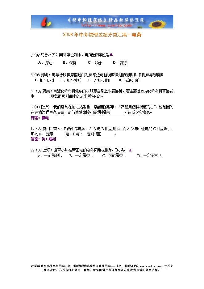 5(08临沂) 我们经常在加油站看到一条醒目的警示:“严禁用塑料桶运汽油”。这是因为在运输过程中汽油会不断与筒壁摩擦,使塑料桶带________,造成火灾隐患。