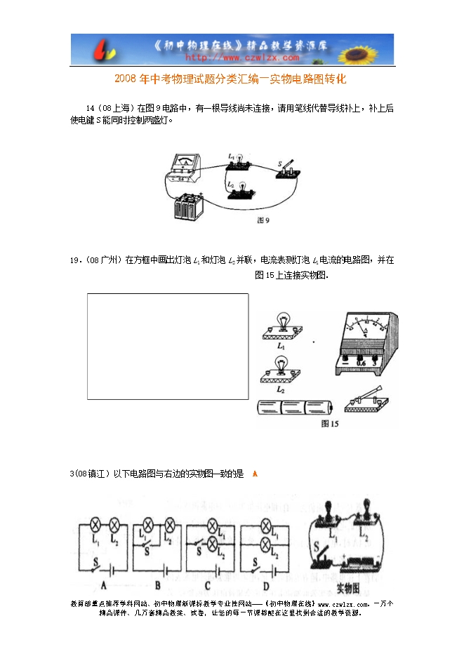 19.(08广州)在方框中画出灯泡L1和灯泡L2并联,电流表测灯泡L1电流的电路图,并在图15上连接实物图.