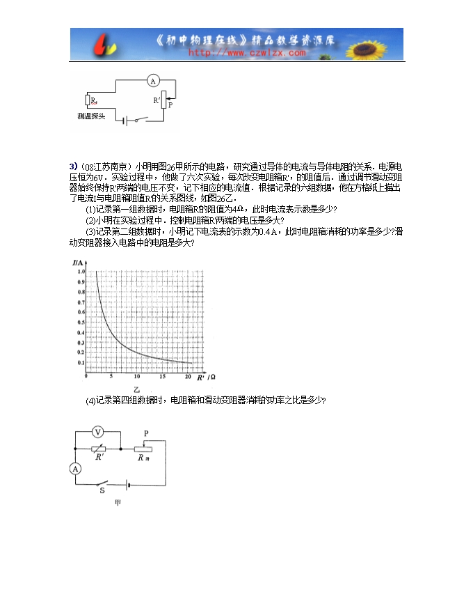2)(08江苏连云港)研究表明,有些金属电阻的阻值会随温度的变化而变化,物理学中利用这类金属的特性可以制成金属电阻温度计,它可以用来测量很高的温度,其原理如图所示。图中电流表量程为0~15mA(不计其电阻),电源的电压恒为3V,R′为滑动变阻器,金属电阻作为温度计的测温探头,在t≥0℃时其阻值Rt随温度t的变化关系为Rt=100+0.5t(单位为Ω)。