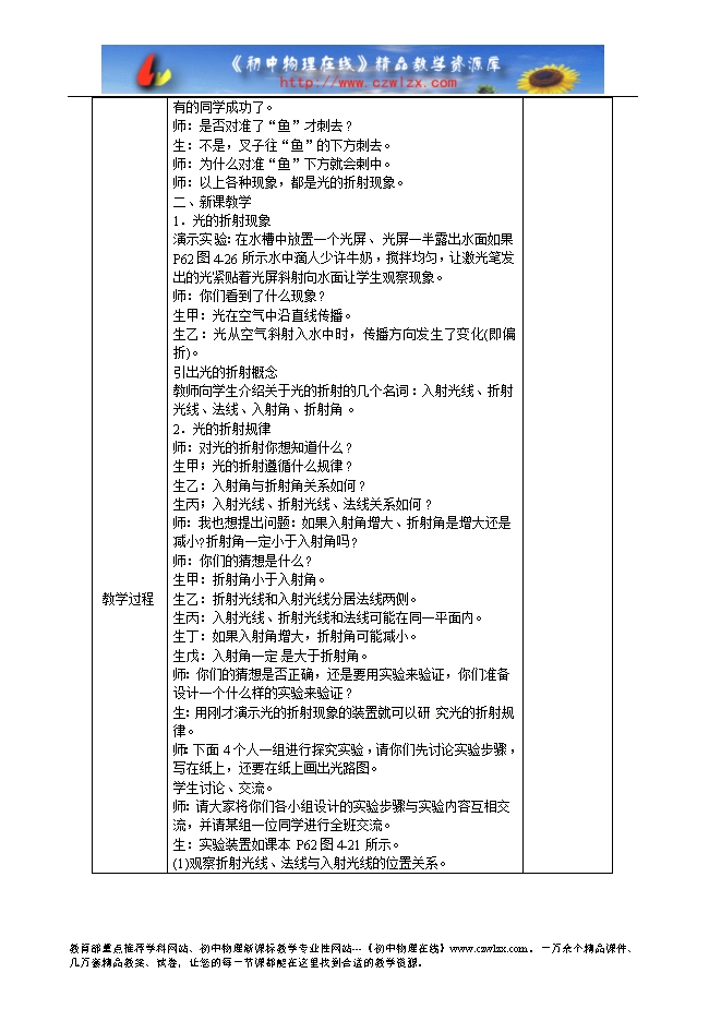 过程与方法 1、通过对大量光的折 射现象的具体分析,设疑和提出问题,培养发现问题和提出问题的科学探究能力。2、通过实验探究,培养实验操作能力。