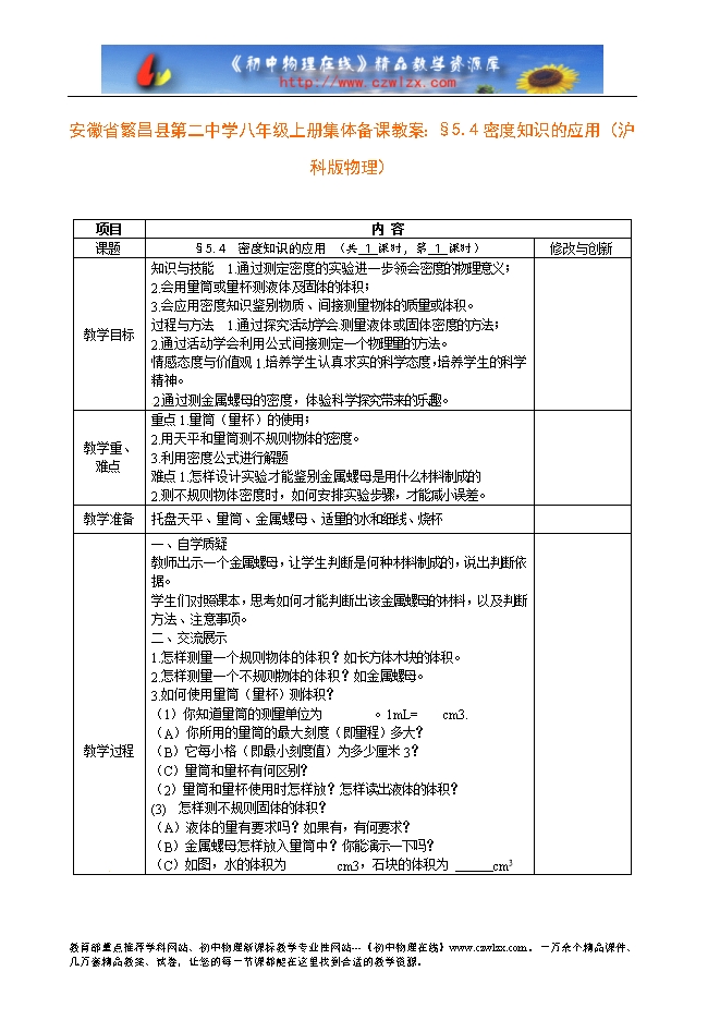 安徽省繁昌县第二中学八年级上册集体备课教案:§5.4密度知识的应用(沪科版物理)