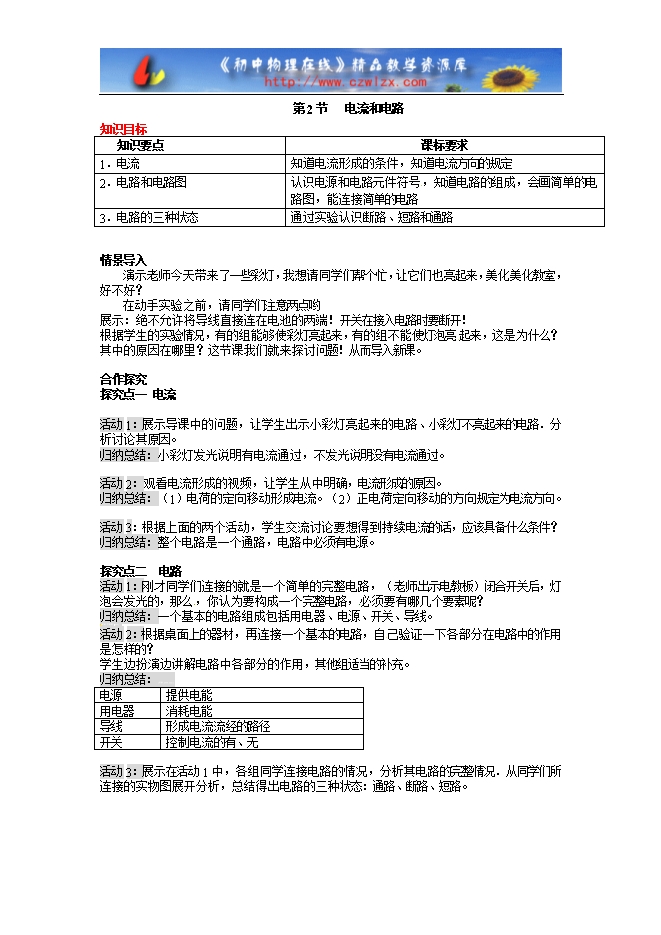 【内容简介】   第 2 节    电流和电路     知识目标       知识要点     课标要求     1 . 电流     知道电流形成的条件,知道电流方向的规定     2 .电路和电路图     认识电源和电路元件符号                                                                             ,知道电路的组成,会画简单的电路图,能连接简单的电路     3 .电路的三种状态     通过实验认识断路、短路和通路     教学过程     情景导入     演示老师今天带来了一些彩灯,我想请同学们帮个忙,让它们也亮起来,美化美化教室,好不好?     在动手实验之前,请同学们注意两点哟     展示:绝不允许将导线直接连在电池的两端!开关在接入电路时要断开!     根据学生的实验情况,有的组能够使彩灯亮起来,有的组不能使灯泡亮         起来,这是为什么?其中的原因在哪里?这节课我们就来探讨问题!从而导入新课。         合作探究     探究点一 电流         活动 1 : 展示导课中的问题,让学生出示小彩灯亮起来的电路、小彩灯不亮起来的电路.分析讨论其原因。   归纳总结: 小彩灯发光说明有电流通过,不发光说明没有电流通过。         活动 2 : 观看电流形成的视频,让学生从中明确,电流形成的原因。     归纳总结: ( 1 )电荷的定向移动形成电流。( 2 )正电荷定向移动的方向规定为电流方向。         活动 3 :根据上面的两个活动,学生交流讨论要想得到持续电流的话,应该具备什么条件?     归纳总结: 整个电路是一个通路,电路中必须有电源。         探究点二  电路 ......
