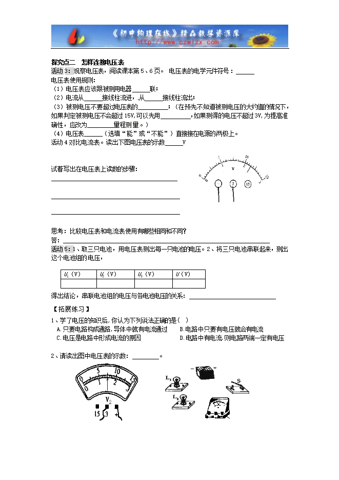 通过阅读说明书,从中收集到有关电压 表连接方法和在电压表上读数的方法的一些信息,得到电压表的一般使用方法