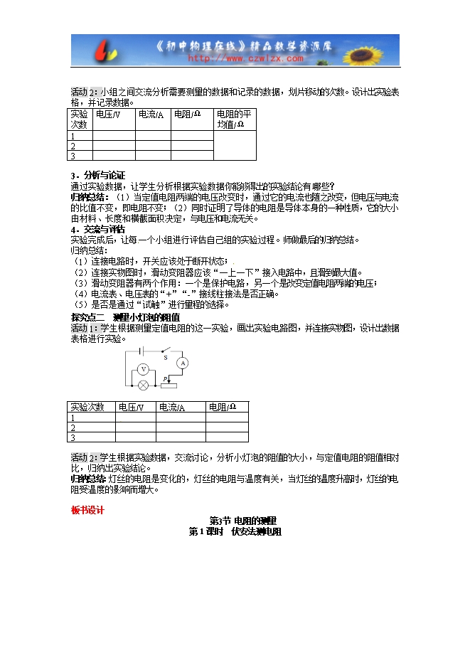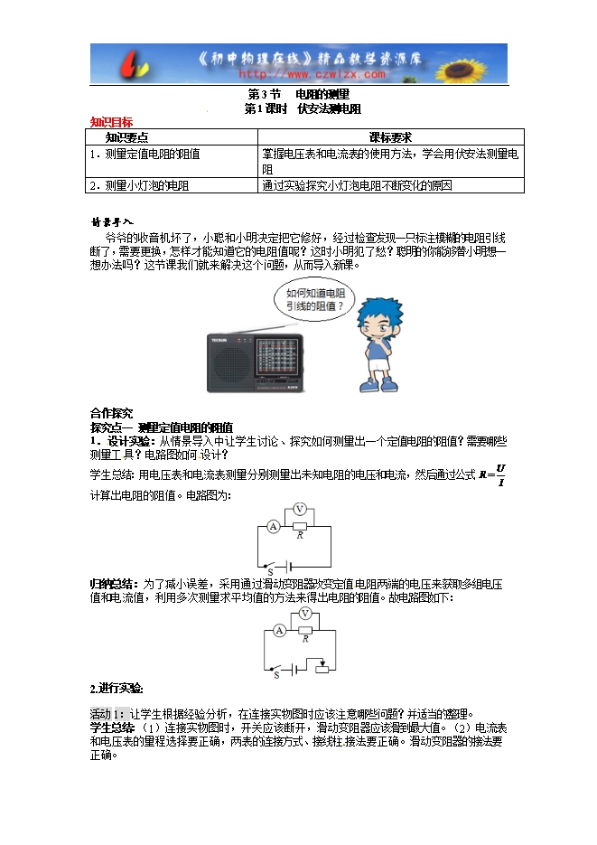 【学练优】人教版九年级物理教学设计:17.3电阻的测量(第1课时 伏安法测电阻)