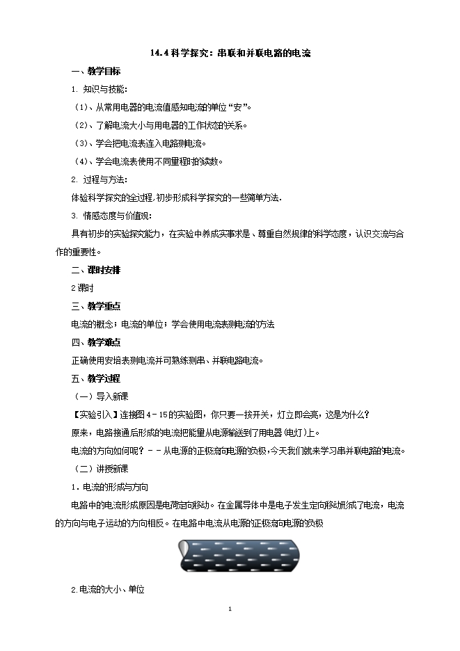 - 1583(沪科版)安徽省无为县第二中学物理九年级集体备课教案:14.4科学探究:串联和并联电路的电流