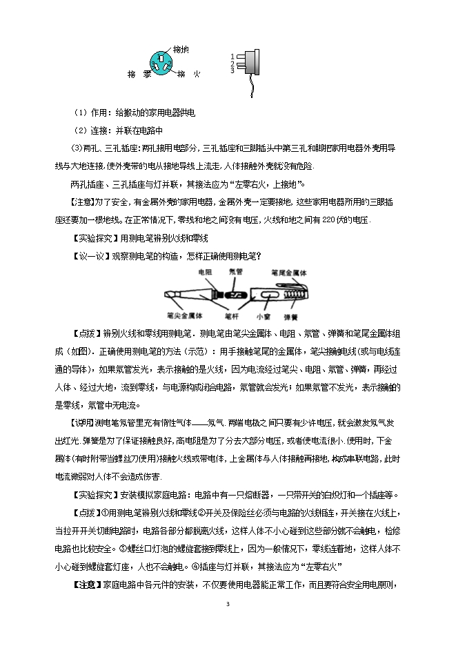 组织学生观察、分析、归纳出家庭电路中各部分的功能.理解家用电器接地的作用。